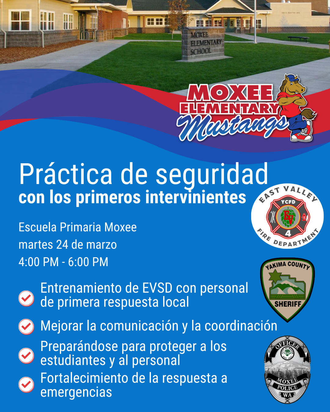 On Tuesday, March 24th, from approximately 4:00–6:00 p.m., East Valley School District will conduct a scheduled safety exercise at Moxee Elementary School.